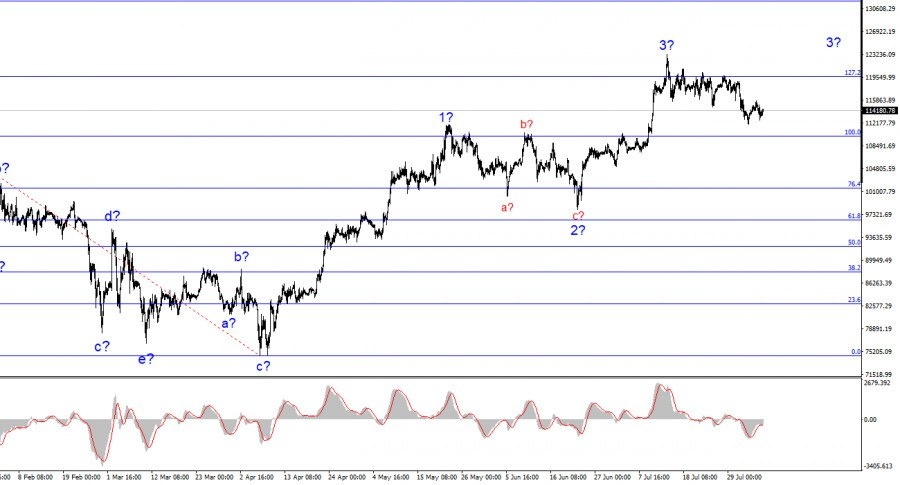 https://basechop.ru/wordpress/?p=52891 Спрос на биткоин продолжает снижаться, но в долгосрочном плане рынок продолжает активно пополнять свои запасы «цифрового золота». Поэтому, вероятнее всего, рост биткоина не завершится около отметки 119600$, что приравнивается к 127,2% по Фибоначчи. Если это предположение верно, то удачная попытка прорыва этой отметки обозначит дальнейшее повышение инструмента с целями, расположенными около отметки 131825$, что соответствует 161,8% по Фибоначчи. Неудачная попытка прорыва отметки 110000$, что соответствует 100,0% по Фибоначчи, также укажет на готовность к построению новой повышательной волны. Новостной фон на этой неделе практически отсутствует, и это откладывает отпечаток и на криптовалютный рынок. Однако не отсутствие новостей является причиной низкой амплитуды движения на этой неделе. 14 июля началось построение коррекционной волны либо в составе 3, либо волны 4. Так или иначе, эта волна продолжает свое построение, а мы знаем, что коррекции обыч