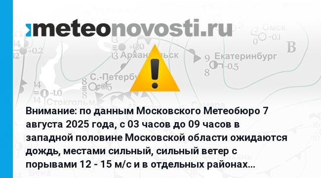 Внимание: по данным Московского Метеобюро 7 августа 2025 года, с 03 часов до 09 часов в западной половине Московской области ожидаются