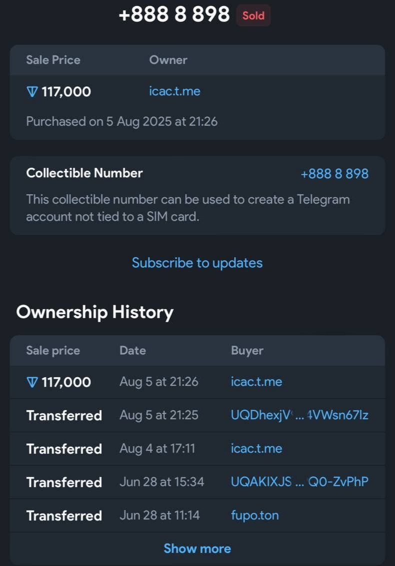 Анонимный номер +888 8 898 был продан вчера за 117к TON (~$380 000).