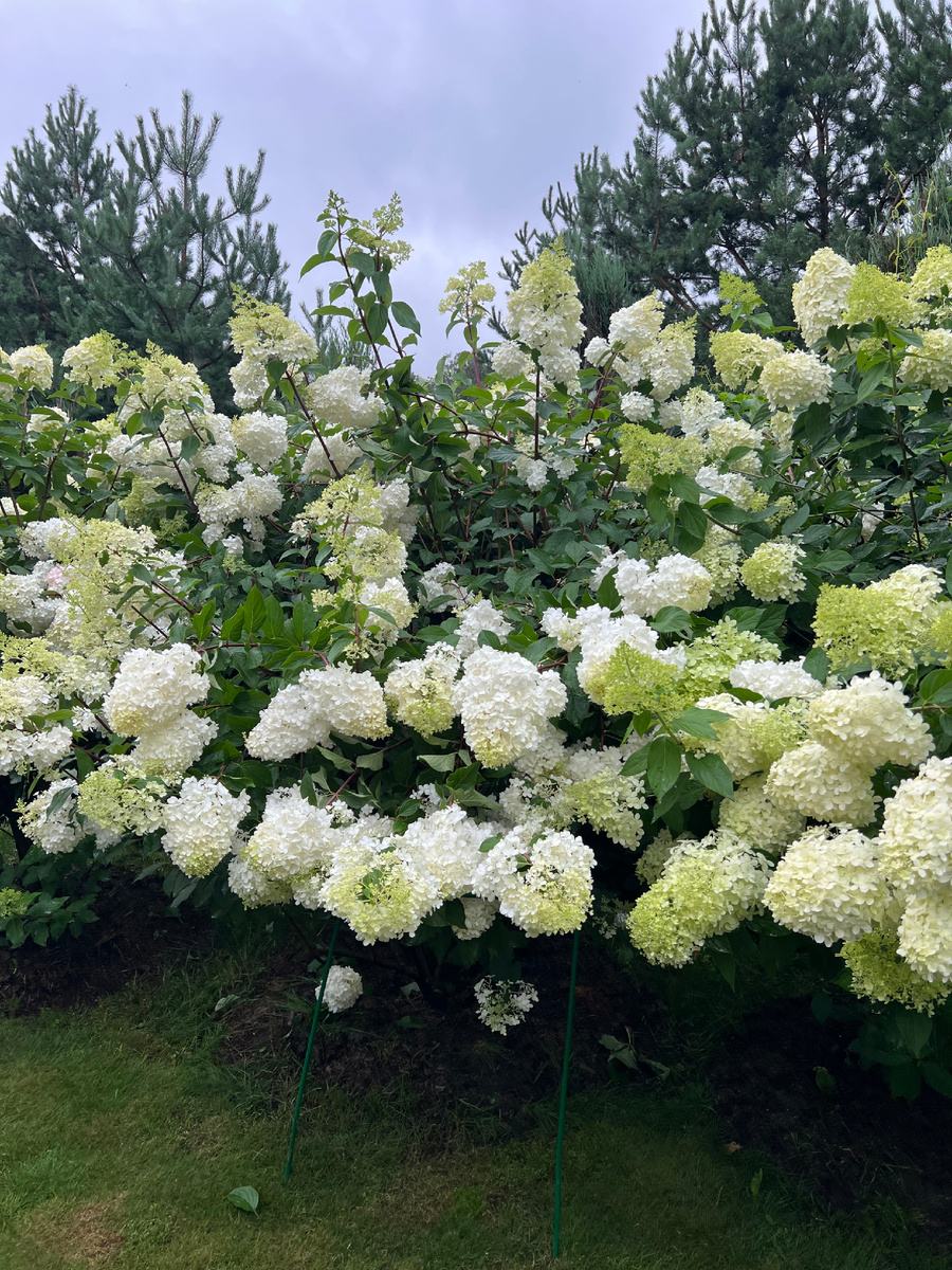 Лило сильно, а главное долго! А это значит намочило шапки цветов, промокли и стали очень тяжелые. С малышами хорошо, можно подвязать хоть каждый побег, хотя бы на время дождей и день на просушку. А вот с гигантами больше 2 метров это сделать тяжело. Во время дождя кусты лучше не трогать. Тяжелые, хрупкие - только переломаете сами все. Итак. Ванила как всегда самая падуче- лежачая. А кто стремится за соцветиями в 40 см вообще «здравствуй газон». Пришлось поставить подпорки, чтобы не сломались ветки. А так вроде ничего Встанет ли сама, когда высохнет? Нет не встанет. И в основном из-за того, что запутались цветы друг с другом. Аккуратно распутываем цветы и поднимаем побеги, помогаем. Многие толстые побеги прекрасно выстояли. Куст высох, подпорки убрала, не люблю я это… Лайм Лайт умница. Ну наклонился конечно, но молодцом, даже не трогала А некоторым товарищам досталось от меня злой. Отрастили хлысты выше меня, все что легло параллельно земле на помойку. Набрался большой мусорный пакет и
