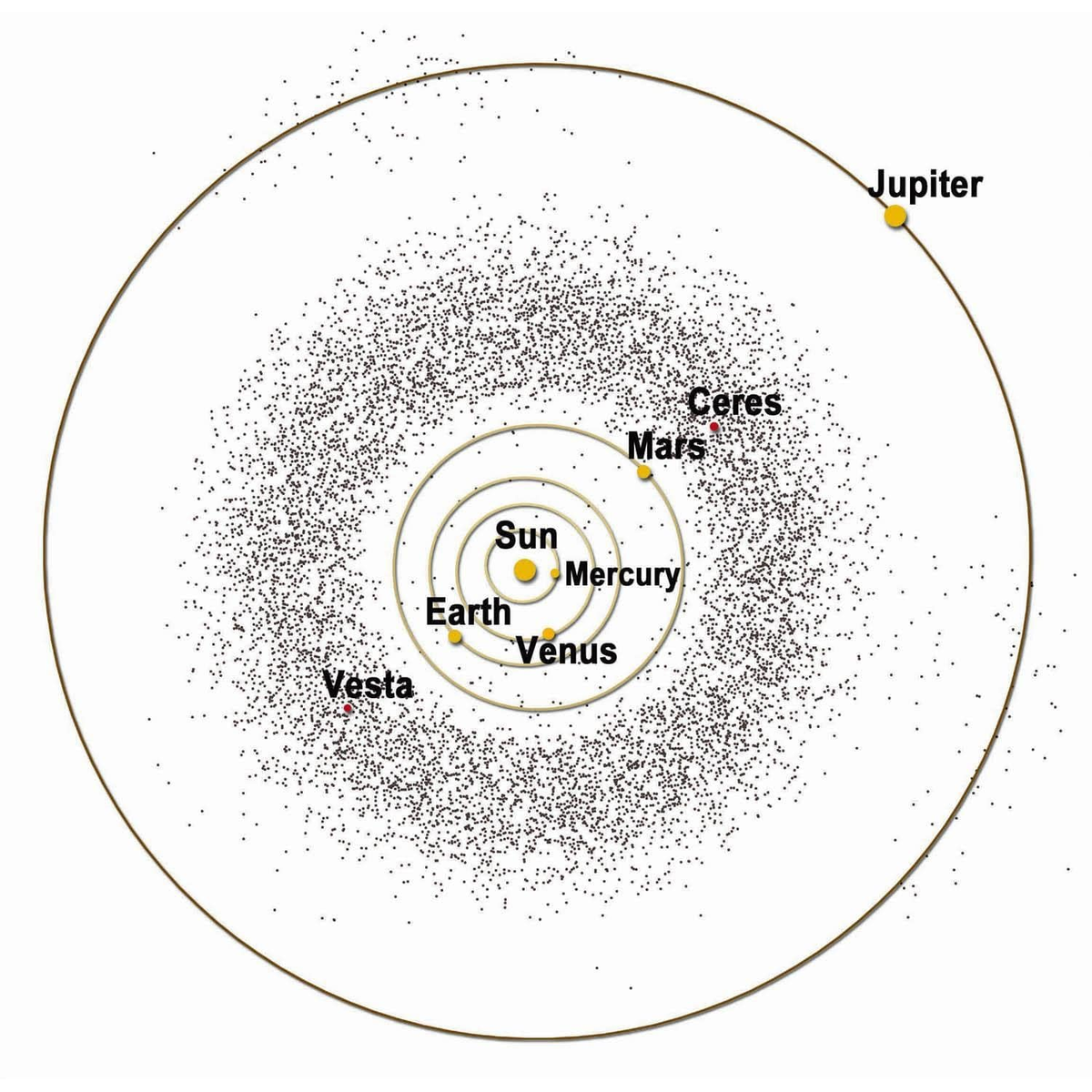 Главный пояс астероидов между Марсом и Юпитером представляет собой не хаотичное скопление, а сложно структурированную систему с выраженной композиционной зональностью и динамическими резонансами. Современные данные показывают семь различных композиционных пиков на расстояниях от 1,8 до 5,2 а.е.. Общие характеристики. Пояс содержит около 60% массы в четырёх крупнейших объектах: Церере, Весте, Палладе и Гигее. Общая масса составляет лишь 4% от массы Луны, что в 2500 раз меньше предполагаемой первоначальной массы. Расстояние между астероидами настолько велико, что космические аппараты проходят через пояс без повреждений. Зональная структура. Пояс традиционно делится на три зоны, разделённые орбитальными резонансами с Юпитером: Композиционная дифференциация. Во внутренней части доминируют S-комплекс астероиды (силикатные), составляющие основную массу крупных объектов. C-комплекс (углеродистые) астероиды редки среди крупных тел (6% массы), но составляют четверть массы среднеразмерных объек