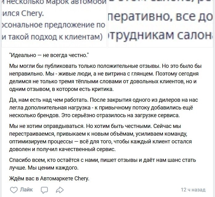 Мы любим писать о не всегда нам понятном китайском маркетинге, но и российский порой подкидывает интересные кейсы. Дилер Chery из Мурманска так и заявил в соцсетях, что очень хочет быть честным. И потому добавил в подборку отзывов такие, где есть критика. Верим, что компания стремится стать лучше. Но верить ли тому, что в условиях явного кризиса на авторынке дилер "привыкает к новым объемам" и "усиливает команду"? Впрочем, в случае с автосалонами Chery речь действительно может идти о добавлении новой линейки автомобилей под другой маркой. Хочешь не хочешь, а усиливать штат придется. 🇨🇳🇷🇺 #chery Наш сайт | Канал "Только новости" | Канал "Только видео" | Казахстан