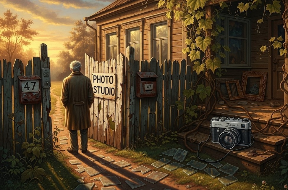 Двор был пуст. Только ржавая фотокамера на крыльце — модель «Зенит-Е», точно такая же, как у него в юности. Он наклонился, чтобы поднять её, но пальцы прошли сквозь металл, будто сквозь дым.