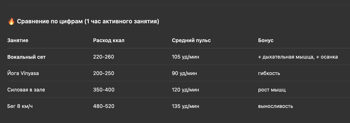 Выбираем между спортом и вокалом: где «сгорает» больше калорий? Спой час хитов в реп-зале — и потеряешь почти столько же энергии, сколько на йоге Vinyasa. А добавишь пешую прогулку — получишь эффект полноценного фитнеса. Разбираемся, как это работает и кому выгодно качать не только тело, но и голос. Почему вокал «жжёт» калории? Итого — ≈ 400 ккал, без забитых мышц и вечного «ещё подход». В «Вокал Всем» (ул. Лобачевского, 94) мы проводим бесплатный урок «Сожги 200 ккал голосом». 55 мин: дыхательная HIIT, упражнения на опору + разбор любимой песни под минус. Записаться словом КАЛОРИИ в личку сообщества — пришлём ближайшее окно. Зал и беговую дорожку никто не отменял, но час вокала «уносит» до четверти их калорий, параллельно прокачивая дыхание и уверенность. Попробуй добавить музыку к тренировкам — и тело, и душа скажут спасибо. 🎤💪
