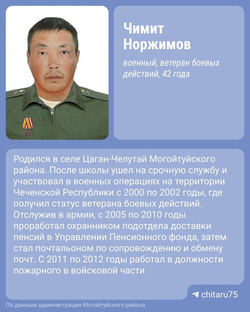 Забайкалец, воевавший в Чечне и в ополчении Донбасса, погиб на СВО. Чимит Норжимов отправился на Донбасс в 2014 году, входил в состав ополчения. Осенью 2022 года подписал контракт с Минобороны, был ранен, получил контузию. После реабилитации он вернулся на СВО. В 2023 году был награжден медалью «Участнику специальной военной операции». У мужчины остались двое сыновей и дочь. 🟦Подписаться | Предложить новость