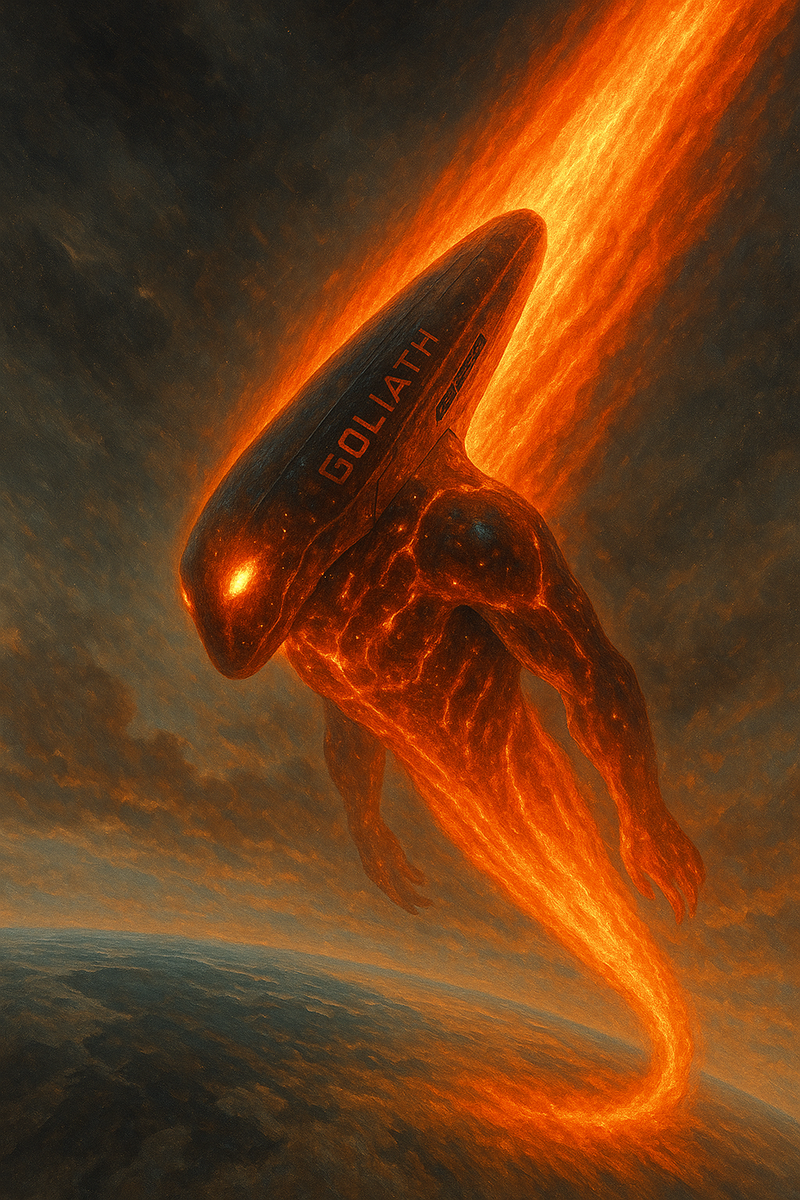 Когда межзвёздный корабль повис на орбите небольшой синей планеты, Голиаф мелкой чешуйкой отделился от дрейфующей громады, и, блеснув длинной искрой планетарного двигателя, начал снижение. Чем дальше он отходил от головного крейсера, тем внушительней себя ощущал в сравнении с быстро удаляющимся чёрным силуэтом. Голиаф верил в свою силу. Его создали способным мыслить, и принимать самостоятельные решения. Конечно, Голиаф знал, что он не человек. Но считать себя просто машиной, он отказывался. Никто не оспаривал его права на самоопределение, напротив, к нему обращались, как к равноценному члену команды. Голиаф был наделён особой привилегией, которая ставила искусственное творение на ступень близкую со своими создателями. У него было собственное имя, и возможность общаться с капитанским мостиком по человечески, голосом.