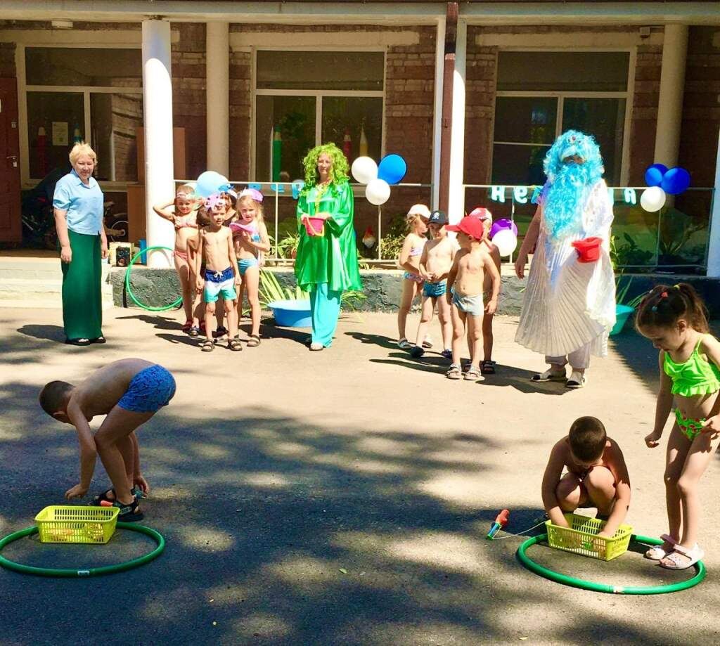 Ребята дружно подпевали веселую «Песенку — чудесенку». Под «шум морского прибоя» появился властитель морей и океанов, рыб, дельфинов повелитель морской царь Нептун со своей дочерью Русалочкой. Они создали атмосферу, напоминающую о волшебном подводном царстве. Ребята показали свою ловкость и смелость в состязаниях. Вот порвалась тонкая ниточка жемчужного ожерелья у Русалочки, и рассыпались по дну морскому жемчужины. Доставать их из воды помогли «рыбки и дельфины». Дети участвовали в играх «Собери раковины», «Поймай рыбку», «Дельфины». Праздник завершился на яркой и позитивной ноте. Царь морей и океанов Нептун всегда приходит в гости летом и разрешает брызгаться водой. По его приказу: «1, 2, 3 — не зевай, друг друга водою обливай», дошкольники повеселились, получив много радостных впечатлений и эмоций. Нам пришла пора прощаться,