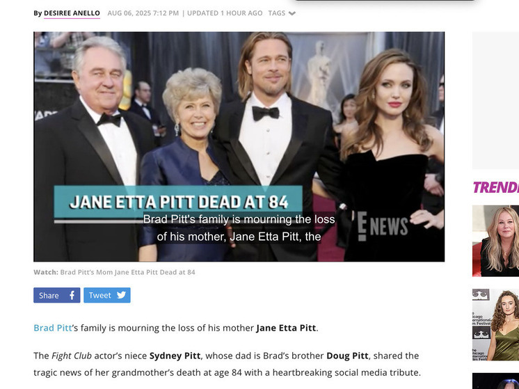 Джейн Этта Питт, мать знаменитого голливудского актера Брэда Питта, скончалась в возрасте 84 лет, сообщает издание People. Новость о ее смерти подтвердила племянница актера, Сидни, отметившая, что женщина ушла из жизни всего за несколько дней до своего 85-летия. По словам Сидни, Джейн Этта теперь обрела покой и свободу, и снова может заниматься любимыми делами — пением, танцами и рисованием. Она подчеркнула, что у покойной было огромное сердце, и она всегда искренне заботилась о близких и окружающих. В прошлом Джейн Этта Питт работала школьным психологом и воспитала троих детей. В последние годы ее здоровье ухудшилось. Ранее Брэд Питт купил у гитариста The Killers особняк в Лос-Анджелесе за $12 млн. Подпишитесь на Telegram "МК": еще больше эксклюзивов и видео! Автор: Олег Тимофеев
