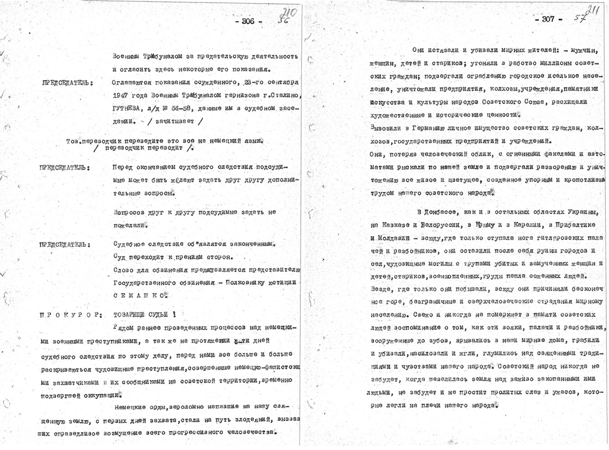 8 сентября 1943 г. в ходе Донбасской военной операции Красная Армия освободила Сталино (современный Донецк). 24–30 октября 1947 года в городе прошел открытый судебный процесс над военными преступниками. Областной комиссией ЧГК было установлено, что в Сталинской области немецко-фашистские захватчики убили, замучили и расстреляли 174 416 человек, пытали, истязали и убили – 149 367 советских военнопленных, более 250 тыс. советских граждан угнали в немецкое рабство. Ущерб, причиненный немецкими захватчиками и их сообщниками гражданам, колхозам, общественным организациям, государственным предприятиям и учреждениям, только по одной Сталинской области исчисляется в сумме более 19 млрд рублей. Перед отступлением 7 сентября 1943 г. в сарае второго дома профессуры нацисты сожгли заживо 150 жителей дома, главным образом научных работников и преподавателей Донецкого индустриального института и членов их семей. Подробнее о том, что творилось в Сталино и на Донбассе во время нацистской оккупации, ч