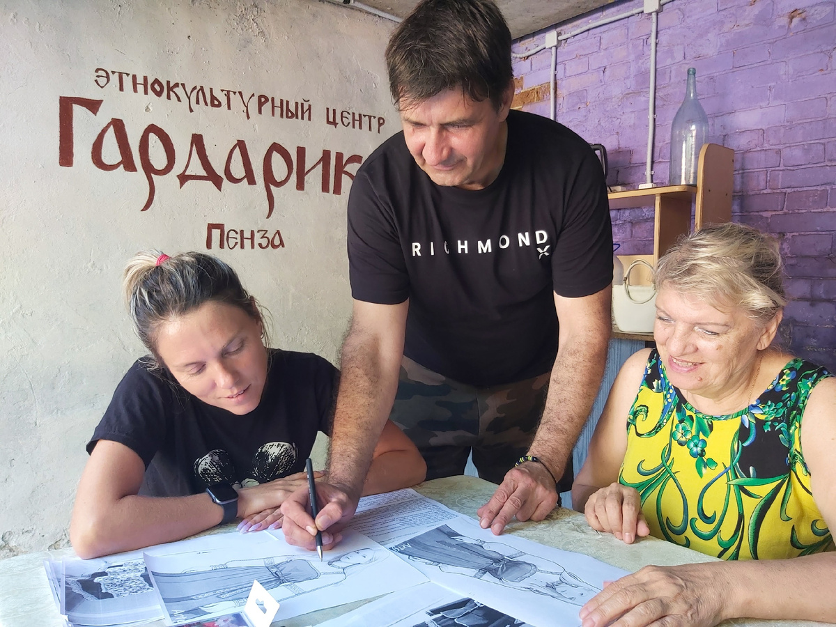 Председатель Пензенского областного отделения Русского географического общества Игорь Пантюшов, руководитель этнокультурного центра "Гардарика" Евгения Пискунова и режиссер центра Анна Минеева активно обсуждали дизайн костюмов для сценок и театрализованных концертных программ, которые пройдут по всей Пензенской области. Дизайн образов разработан пресс-секретарем отделения Марией Чередовой.