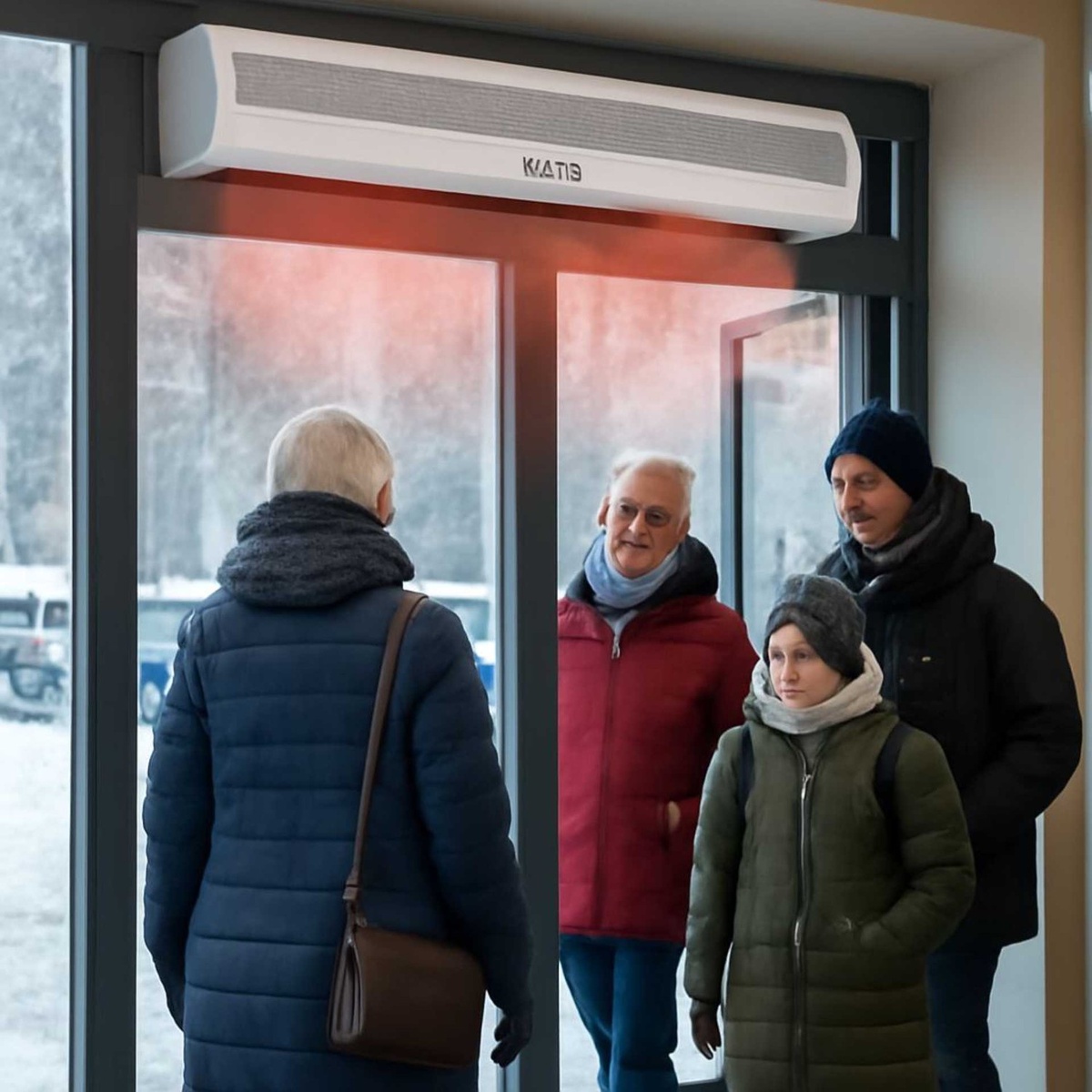 Тепловая завеса эффективно защищает помещение от проникновения холодных воздушных масс даже при открытых дверях, создавая барьер из нагретого воздуха, тогда как обычный тепловентилятор лишь обогревает воздух внутри комнаты.