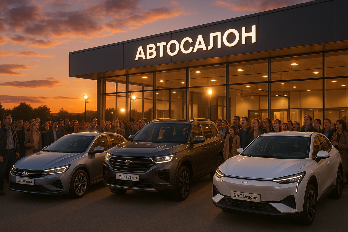 На витринах - новые Lada, Москвич, GAC, Chery, Haval.