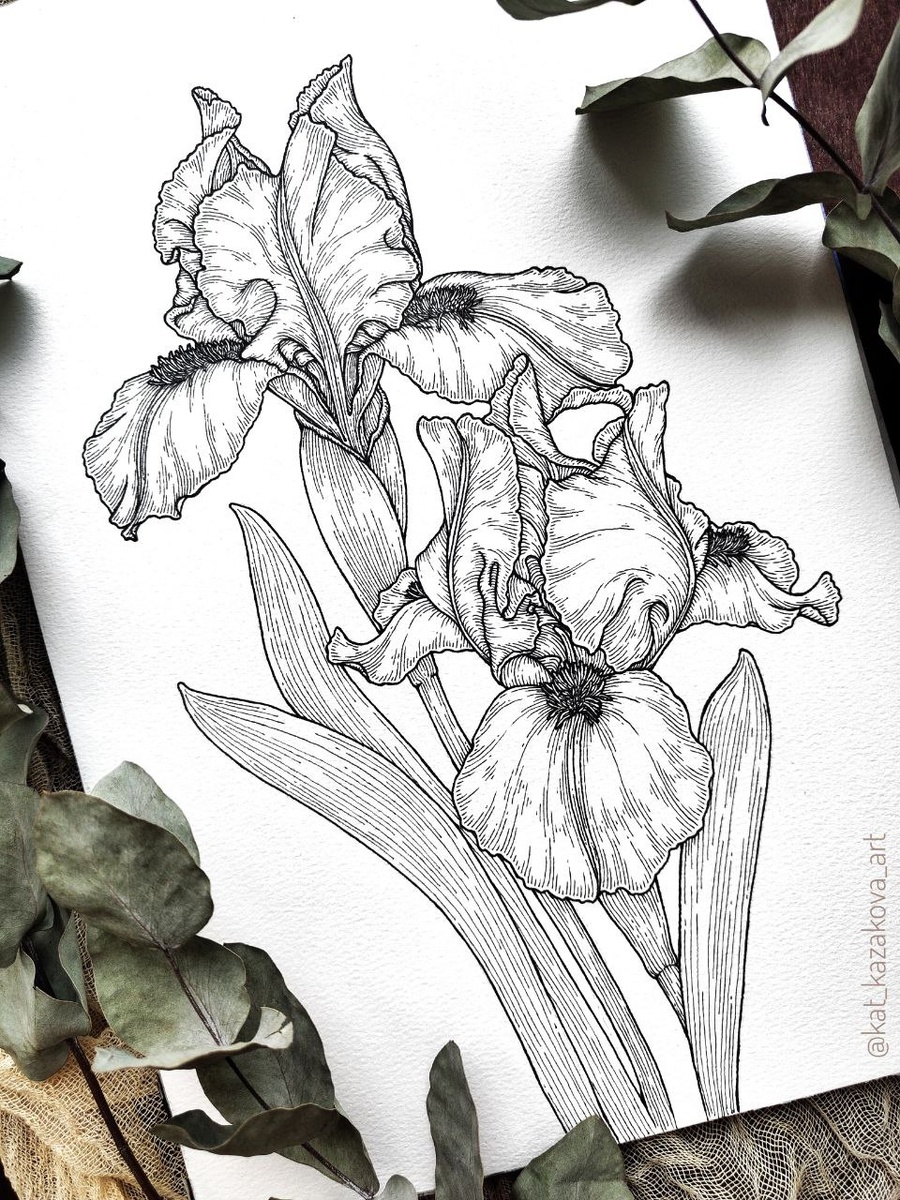 3 секрета для ровной штриховки цветов линером: 1. Сначала проведите несколько линий по направлению прожилок на лепестках (они послужат вам направляющими), а потом заполняйте промежутки. 2. Крутите и вертите лист во все стороны, когда рисуете, чтобы вам было удобно проводить линии в любом месте рисунка. 3. Зафиксируйте лист бумаги, чтобы он не прогибался под нажимом линера (такое бывает, когда рисуешь в скетчбуке или на бумаге средней плотности): если рисуете в скетчбуке, закрепите зажимом, если на листе - приклейте по периметру к планшету малярным скотчем. Так бумага будет натянута, и рисовать станет удобнее.