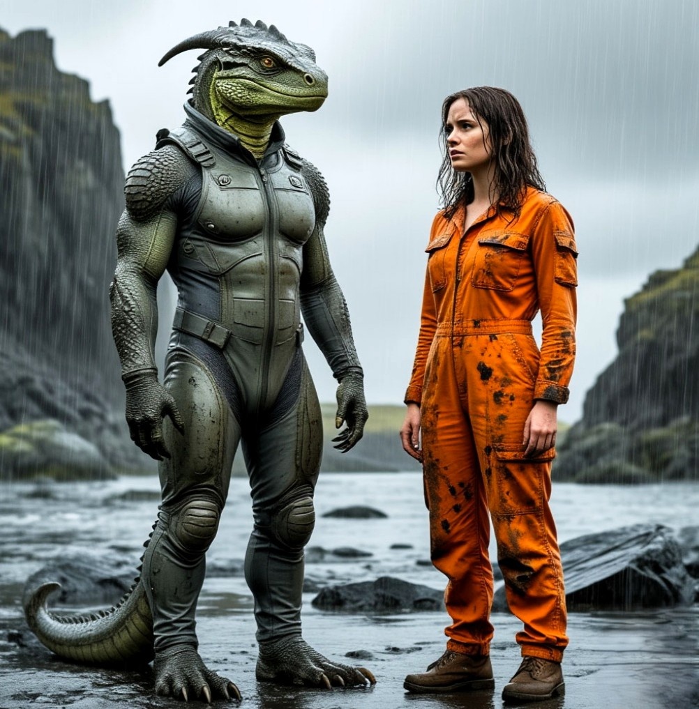 Он стоял, рассматривая ее. Двуногий. Человекообразный, но… не человек. Тело покрыто мелкими, переливающимися изумрудом и бронзой чешуйками. Голова – удлиненная, с мощными челюстями без губ, глаза – большие, золотистые, вертикально-щелеватые, как у кошки, но с глубиной и интеллектом, от которых похолодела кровь в жилах Алины. Руки – длинные, с четырьмя тонкими, но явно сильными пальцами, оканчивающимися короткими, острыми когтями. На нем было нечто вроде серого комбинезона из плотной, матовой ткани, сливающегося с камнями. Ни страха, ни агрессии – только холодное, оценивающее наблюдение. Как ученый смотрит на редкий, потенциально опасный образец.