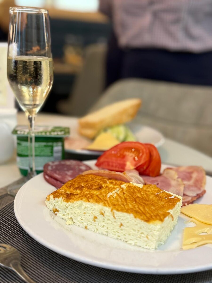 Омлет, помидорка, бекон, сыр, хлеб и игристое. Это обычный завтрак нашего админа на теплоходе «Fun&Sun Cruise. Нижний Новгород». К слову, судно следует из Гориц к Кижам. А как начинают свой день подписчики Крыши?