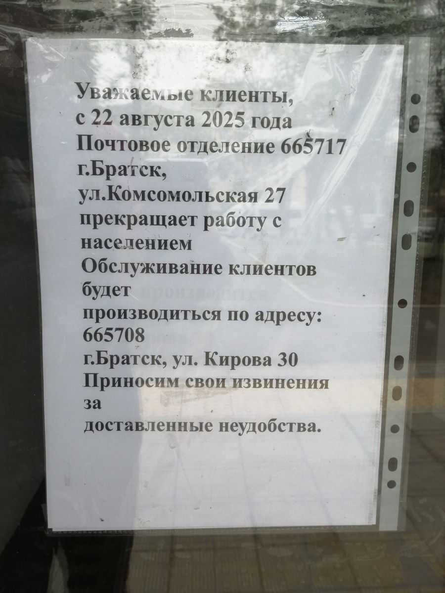 Почтовые услуги в Братске становятся всё менее доступными для населения. 22 августа будет закрыто ещё одно отделение связи, № 717, на улице Комсомольской, 27. Его клиентов переведут на обслуживание в отделение № 708 на ул. Кирова, 30. Объявление об этом разместили связисты. Горожане распространили его в социальной сети, сообщает Братская студия телевидения. Напомним, менее недели назад временно прекратило функционировать отделение № 710 на улице Баркова, 23а. Братчанам, которые получали в нём письма, посылки и пенсии, предложили обращаться на почту на улице Карла Маркса, 22. Что, мягко говоря, не слишком удобно престарелым жителям Телецентра. В июне-июле произошла неразбериха, связанная с приостановкой работы ещё двух отделений, на улицах Муханова и Гагарина. В результате всех клиентов перенаправили на улицу Обручева. Пресс-служба Почты России объяснила происходящее летними отпусками, больничными и кадровым дефицитом. По данным на 15 июля, из 21-го городского отделения 15 были временн