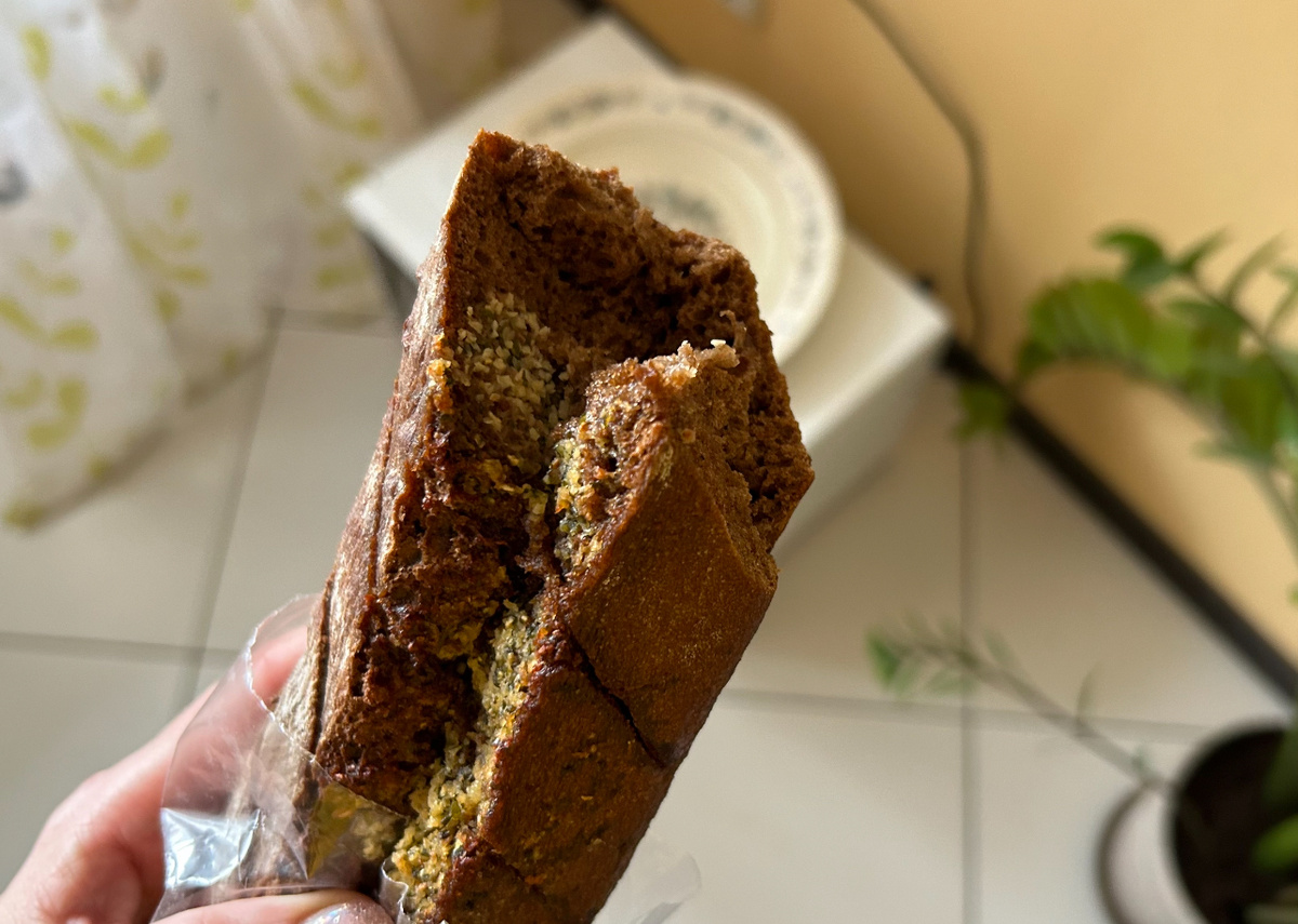 «Что это? Хлеб? Я хлеб не ем. Ой, вкусно! М-м-м… Такой ярко выраженный фруктовый вкус и не очень сладко. Вкусно-вкусно!»
