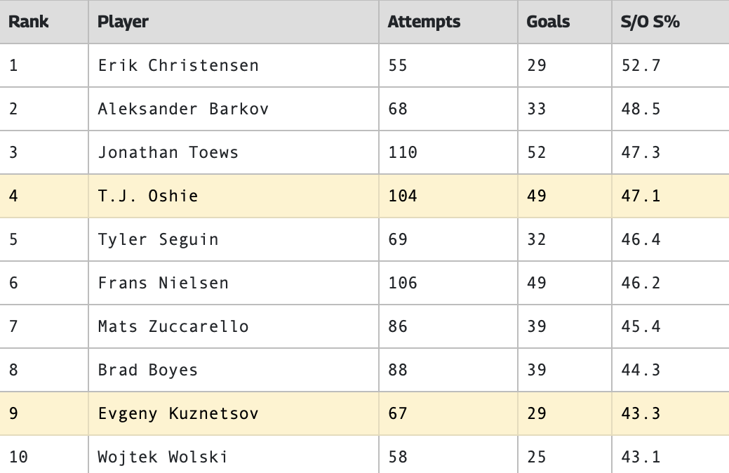 Болельщики «Вашингтон Кэпиталз» слишком хорошо знают, насколько нервным может быть буллит в НХЛ. В прошлом сезоне команда выиграла лишь две из пяти послематчевых серий и до марта не одержала ни одной победы. Многие ностальгируют по временам, когда «Кэпс» чаще добывали дополнительное очко по буллитам – особенно тогда, когда главными лицами команды в серии были Ти Джей Оши и Евгений Кузнецов. Эти двое входят в число лучших исполнителей буллитов с момента введения формата в сезоне 2005/06. Среди игроков, совершивших как минимум 50 попыток, Оши и Кузнецов занимают места в топ-10 по проценту реализации в истории лиги. Ти Джей – четвёртый с показателем 47,1%, Евгений – девятый с 43,3%. Лишь один игрок с более чем 50 попытками имеет показатель выше 50% – это Эрик Кристенсен (52,7%). Десятую строчку занимает Войтек Вольски, который также играл за «Кэпиталз» (27 матчей в сезоне 2012/13), но в серии буллитов за команду не выходил. Лучшие показатели реализации буллитов в истории НХЛ (минимум 50