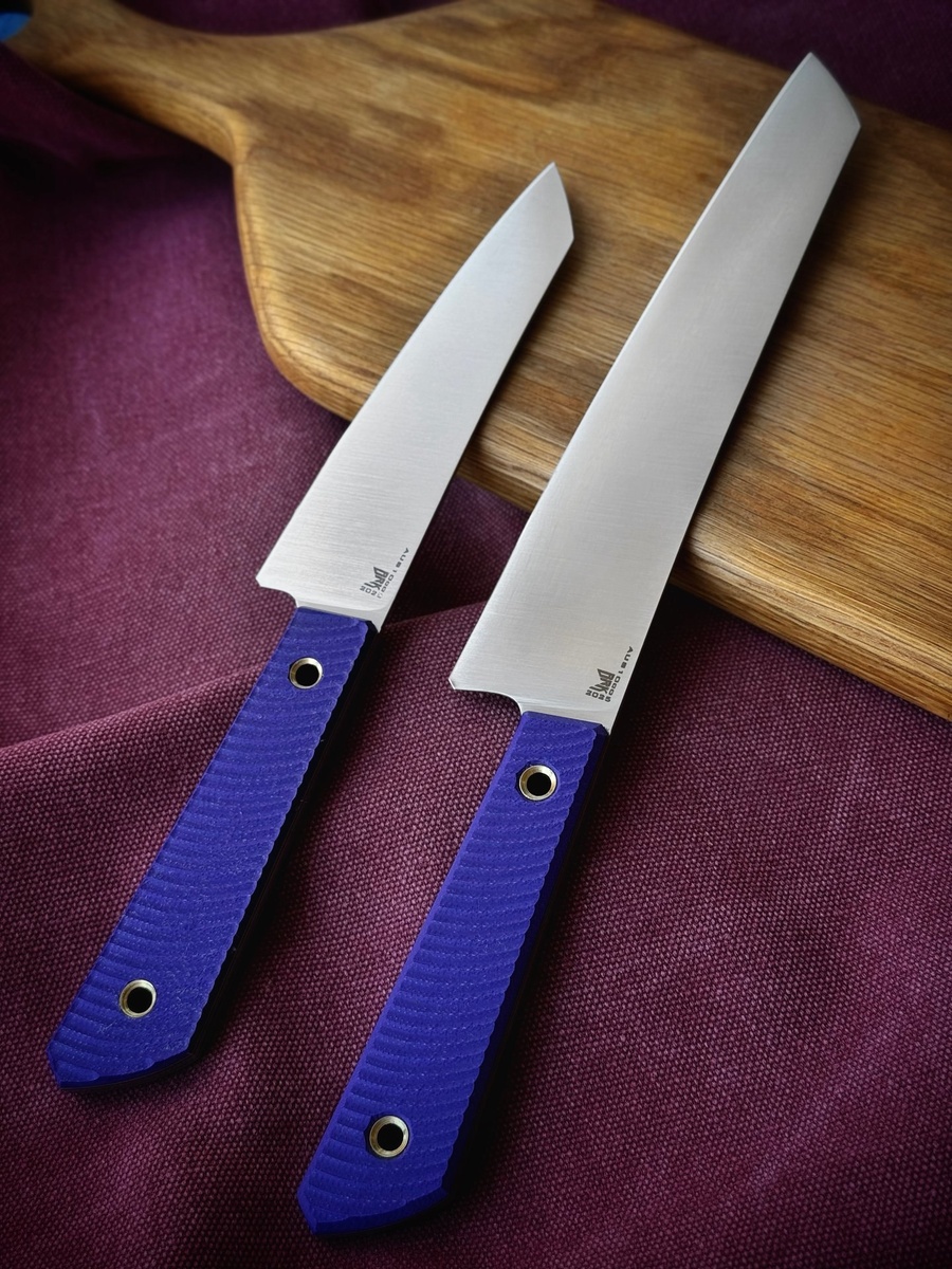 Новенькие практичные кухонные ножи – "Кирицуки". Есть два размерных варианта: с клинком 125 мм и 180 мм. Обух составляет 2.5 мм. Клинки выполнены из неприхотливой стали AUS10Co, а на рукояти G10 c насечкой. ‼️Вести диалог только с @burlax1