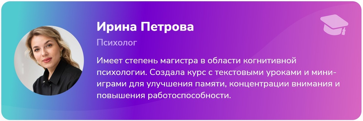 Это не просто набор советов — это полноценный тренажёр у вас в телефоне с мини-играми, заданиями и уроками от профессионального когнитивного психолога Ирины Петровой.