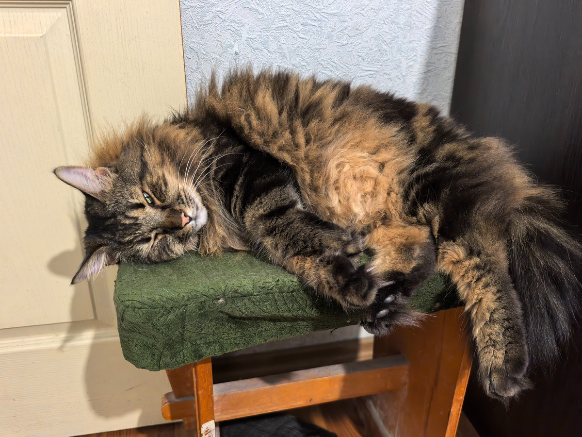 Всем привет! С вами Кузя Кусалочкин (он же царь Кузьма I). Сегодня я расскажу, что там с моим аппетитом и почему хозяйка устроила глобальную уборку. Утро началось стандартно. Встала хозяйка, и я вместе с ней, мне подали паштетик на царской тарелке. Паштетик весь слопал, проголодался. А вот мясо, то, что мне на ночь оставляли, только поковырял. На новые каналы я сейчас не подписываюсь. Дружить, забежать в гости времени нет. Поэтому был голодным и весь паштет сразу съел. Ещё мне дали кошачью колбаску (хозяйка даже измельчила её и покормила меня с ручки) и сливочки. И ушёл спать: Бо́льшую часть дня я сплю на этом старом стуле. Неплохое место, мой размерчик. И, кстати, около этой стенки немного прохладнее. А хозяйка и рада, что я не топчусь по полу. Хозяйка сначала своими делами занималась, сидела за ноутбуком. А потом пошла убирать на балконе. И не просто так убирать, а глобальную уборку решила сделать. Дело в том, что есть подозрения, что в цветах завелись блохи. На хозяйку две напали