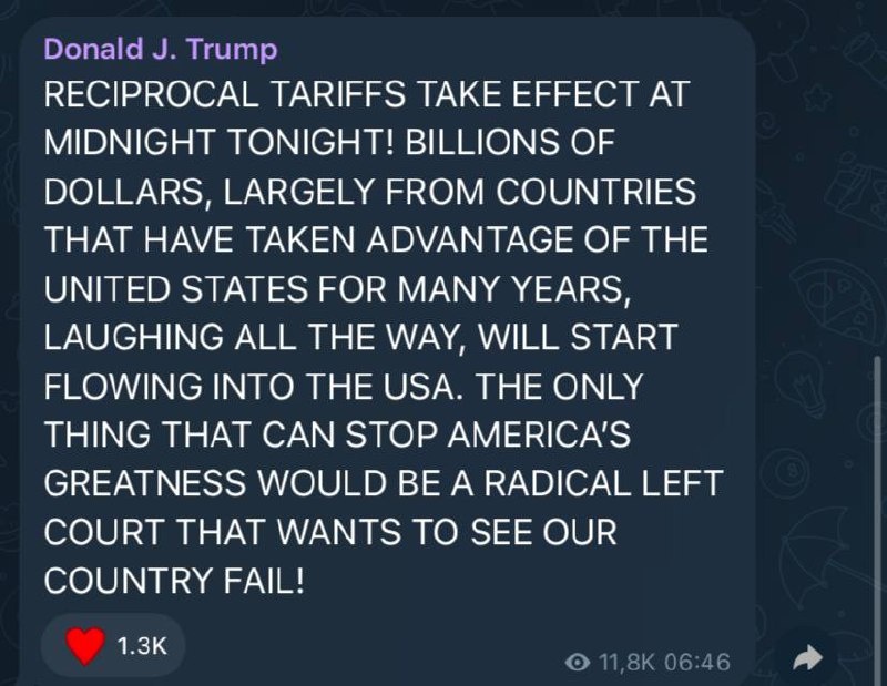Трамп подтвердил, что сегодня пошлины вступили в силу «Взаимные пошлины вступают в силу сегодня в полночь! Миллиарды долларов, в основном из стран, которые долгие годы пользовались преимуществами США, смеясь при этом во весь голос, начнут поступать в США». Президент США добавил, что единственное, что может остановить величие Америки, — это «радикально левый суд, желающий увидеть крах его страны». Дал подсказку? 👍 БайБайден. Подписаться