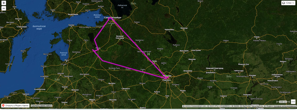 Маршрут: Москва → Санкт-Петербург → Финский залив (Курортный район) → Кронштадт → Ломоносов (Ораниенбаум) → Чудское озеро → Псков → Изборск → Печоры → Пушкинские Горы (Михайловское) → Москва.