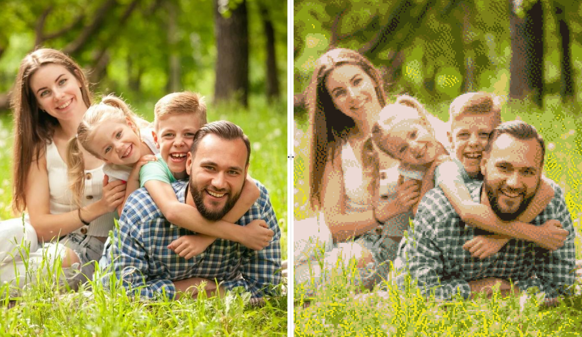 - Диффузия в вышивке — делает переходы более плавными. С выключенной диффузией границы цветов будут резче. Включайте, когда нужны мягкие градиенты: портреты, небо/вода/туман, цветы, животные, закаты — переходы выглядят ровнее и естественнее. Выключайте, если вышиваете мультяшных персонажей, орнаменты, иконы, пиксель-арт и любую чёткую геометрию — там важны ровные контуры.