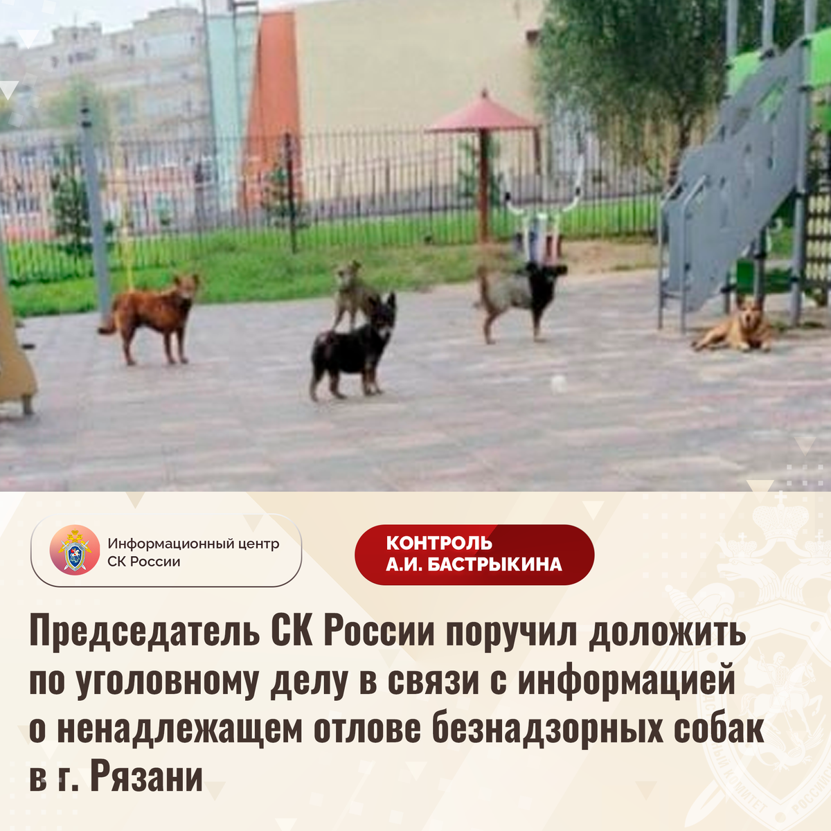 Председатель СК России поручил доложить по уголовному делу в связи с информацией о ненадлежащем отлове безнадзорных собак в г. Рязани В телеграм-канале сообщается, что в городе Рязани, в том числе вблизи детского сада, обитает большое количество безнадзорных собак, проявляющих агрессию к прохожим. В связи с этим граждане опасаются за свою жизнь и здоровье, а также за безопасность своих детей. Ситуация освещается в СМИ. В СУ СК России по Рязанской области расследуется уголовное дело, ход которого ранее А.И. Бастрыкиным поставлен на контроль в центральном аппарате ведомства. Председатель Следственного комитета Российской Федерации Александр Иванович Бастрыкин поручил руководителю СУ СК России по Рязанской области Олегу Алексеевичу Васильеву представить доклад о предварительных и окончательных результатах расследования уголовного дела. Исполнение поручения поставлено на контроль в центральном аппарате ведомства. #СледственныйКомитет #СКРоссии #СКР #ИЦСКР #ИнформационныйЦентр #АлександрБа