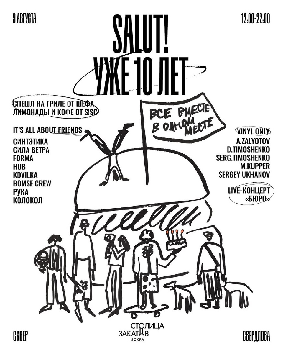 SALUT! 10 YEARS TOGETHER В эту субботу, 9 августа, Salut! отмечает свой первый серьезный юбилей — 10 лет! В программе дня и вечера: Гастрономия - Специальное гриль-меню от шеф-повара - Бар с освежающими напитками и кофе от шеф-бармена Юрия Тихонова и шеф-бариста Salut! Specialty Coffee Инны Царевой Маркет со стилевой одеждой и множество творчества Активности - Йога на траве в сквере Свердлова от FORMA - Корнер от парусного комьюнити «Сила Ветра» Музыка - Весь день за диджейским пультом будут: Сеня Залетов, Дима Тимошенко, Сергей Тимошенко, Макс Куппер, а также идейный вдохновитель бургерной — Сергей Уханов - Хедлайнер вечера, который добавит финальных искр в этот праздник — группа «Бюро» 9 августа 12:00 - 22:00 Октябрьская, 9а 😄 Мероприятия Нижний Новгород. Я местный!