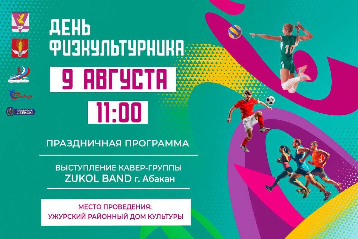 День физкультурника пройдет в РДК ✅В субботу 9 августа в 11.00 в районном Доме культуры состоится торжественная церемония награждения работников спортивной отрасли и праздничный концерт. 💥В этот день мы чествуем всех, кто занимается спортом и ведет активный образ жизни. В программе выступление кавер-группы ZUKOL BAND г. Абакан. Приглашаем всех присоединиться к праздничному мероприятию! Спортивные соревнования переносятся из-за неблагоприятных погодных условий. Информация об их проведении будет сообщена позднее.———————————————— 🌐 Сайт | 📱 Тelegram | 📱 ВК |📲 ОК