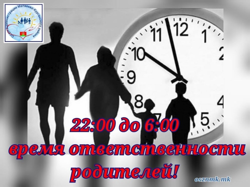 Детям до 16 лет запрещено находиться в общественных местах без сопровождения родителей (законных представителей) с 22-00 до 6-00 часов. Дети и подростки должны находиться в общественных местах в ночное время только с законными представителями, к которым исключительно относятся родители, либо назначенные опекуны, попечители. Находиться под присмотром старших братьев и сестер, дядей и тетей, совершеннолетних друзей, бабушек и дедушек не разрешается. Если ребенка выявят на улице в неустановленное законом время, ответственность за это несут родители. На каждого из них, либо на одного из родителей составляется протокол об административном правонарушении, который рассматривает комиссия по делам несовершеннолетних и защите их прав, налагается административное наказание в виде предупреждения или штрафа на родителей (лиц, их заменяющих). За повторное правонарушение несовершеннолетний и семья могут быть поставлены на учет.