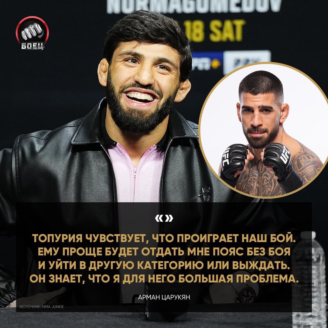 Царукян считает, что Топурия будет избегать его до последнего 😏 Также Арман рассказал о своих планах подраться дважды в этом году: Я уже сказал, что готов драться в сентябре или октябре. Я в хорошей форме и тренируюсь дважды в день. Я готов осенью подраться с любым соперником, а в декабре с Топурией, если будет такое решение Увидим ли мы Армана и Илию в клетке?