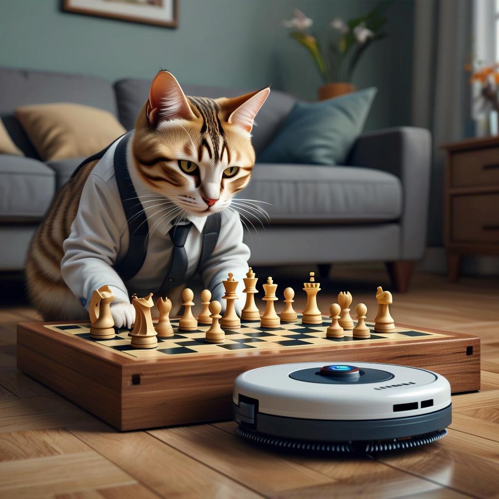 Это была обычная субботняя ночь, когда всё вдруг пошло наперекосяк. Кошка Мурка решила, что настало её время стать чемпионом мира по шахматам. Она уселась перед монитором компьютера и начала методично передвигать фигуры на экране. Но тут случилось непредвиденное — робот-пылесос Roomba неожиданно включился и начал кружить вокруг стола, пытаясь засосать фишки. Кошка Мурка не растерялась и быстро схватила ферзя, спрятав его под диваном. Робот-пылесос, потерявший ориентацию, застрял между ножкой стула и стеной. В этот момент хозяин квартиры, вернувшись домой, увидел странную картину: кошка играет в шахматы, а пылесос пытается атаковать её сзади. Хозяин попытался разобраться в ситуации, но компьютер завис окончательно, а экран покрылся загадочными символами. После нескольких попыток перезагрузки выяснилось, что кошка случайно нажала комбинацию клавиш Ctrl+Alt+Del, вызвав перезагрузку системы. **ПОКАЗАТЬ КОММЕНТАРИИ** К этому моменту ситуация стала настолько абсурдной, что соседи начали сту