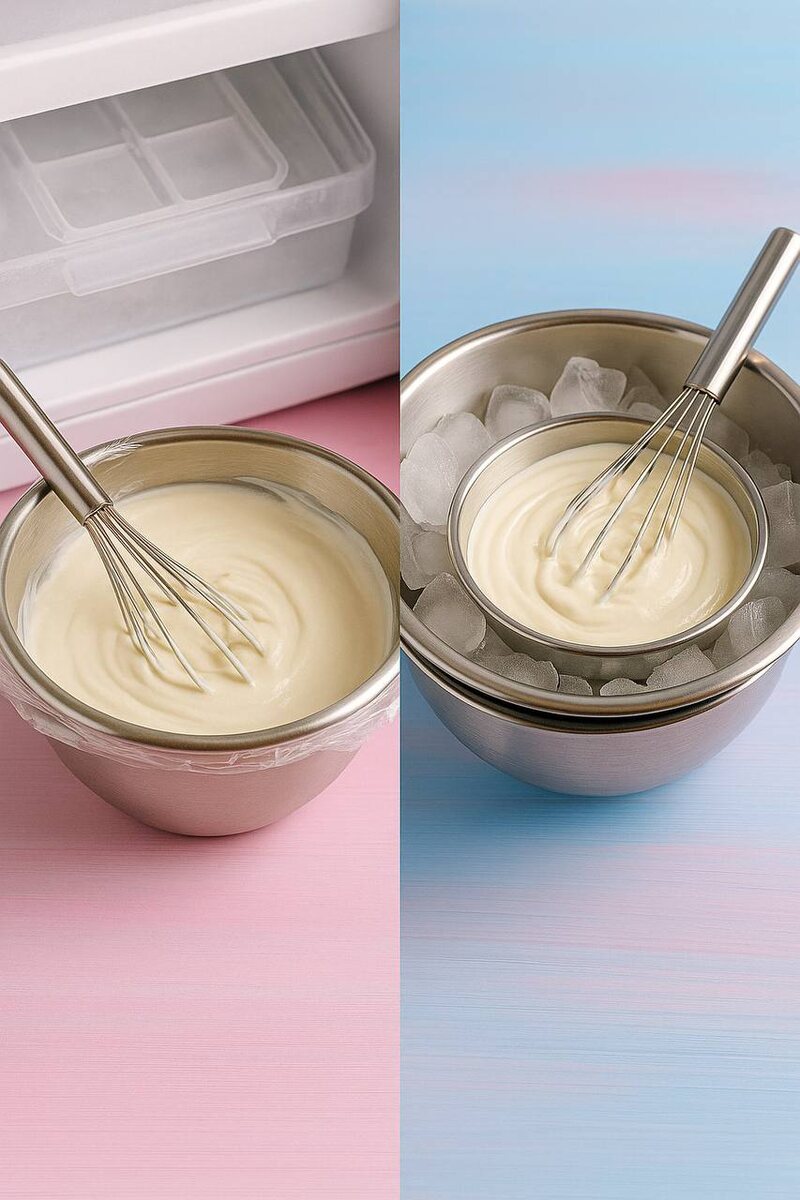 📎 Первый — морозилка: поставь крем на 5–10 минут и обязательно помешивай каждые пару минут, чтобы не замёрз по краям. Подходит для заварных, ганаша и масляных кремов.