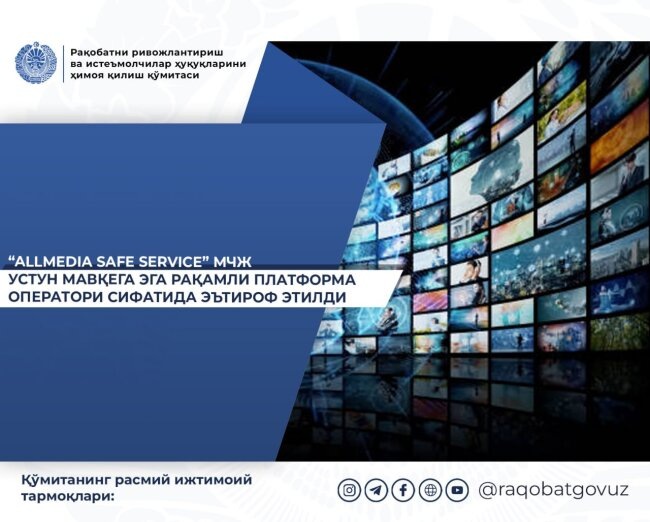 Сообщается, что приказом Комитета организация ООО "Allmedia Safe Service", владеющая онлайн-сервисом "Allplay", признана доминирующей на рынке подобных сервисов в Узбекистане, в сфере трансляции видео, в том числе онлайн-телевидения.