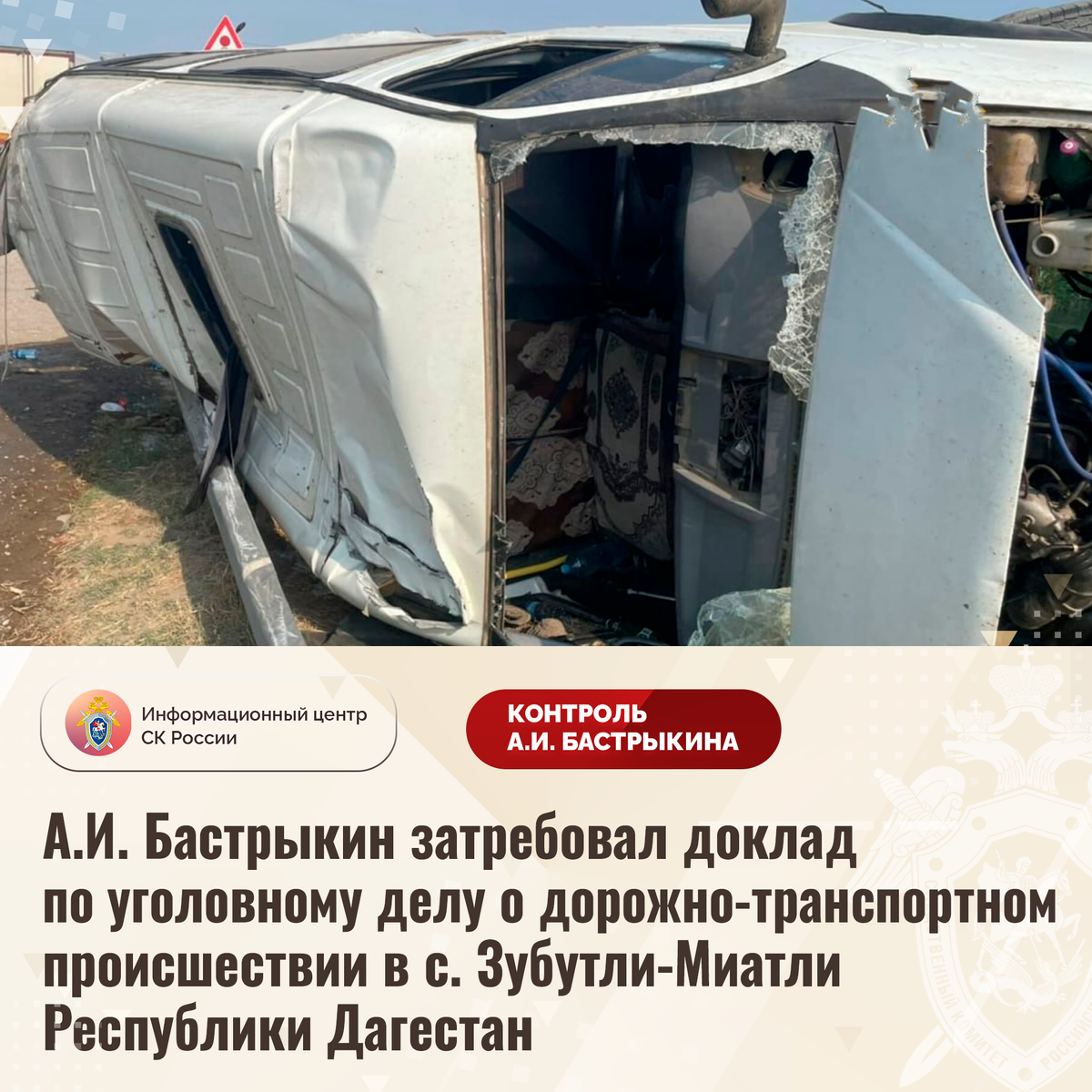 А.И. Бастрыкин затребовал доклад по уголовному делу о дорожно-транспортном происшествии в с. Зубутли-Миатли Республики Дагестан В сети Интернет сообщается о дорожно-транспортном происшествии с участием маршрутного автобуса в селе Зубутли-Миатли Республики Дагестан. Так, 5 августа текущего года водитель, осуществляя перевозку пассажиров, не справился с управлением и допустил опрокидывание транспортного средства. В результате аварии четыре человека получили телесные повреждения, им потребовалась медицинская помощь. В СУ СК России по Республике Дагестан по данному факту возбуждено уголовное дело. Председатель Следственного комитета Российской Федерации Александр Иванович Бастрыкин затребовал у и.о. руководителя СУ СК России по Республике Дагестан Александра Владимировича Супруна доклад о предварительных и окончательных результатах расследования уголовного дела. Исполнение поручения поставлено на контроль в центральном аппарате ведомства. #СледственныйКомитет #СКРоссии #СКР #ИЦСКР #Информ