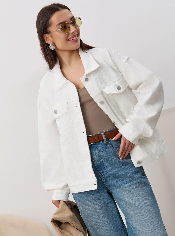 Куртка выполнена из прочного и износостойкого материала с содержанием хлопка и полиэстера — ткань хорошо держит форму, сохраняет опрятный вид и приятна к телу. Классический дизайн с нагрудными карманами, аккуратным воротником и металлической фурнитурой позволяет комбинировать модель с джинсами, брюками, топами и платьями разного фасона. Белоснежный цвет легко сочетается с пастельными, яркими и любыми базовыми оттенками.