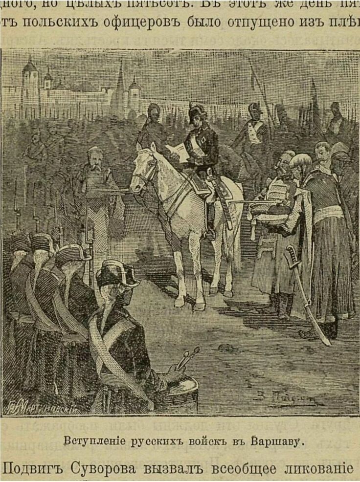 7 августа 1794 года Суворов зачислен в состав армии генерал-аншефа Репнина и возглавил поход на Варшаву. В этом походе Суворов одерживает блестящие победы над польскими конфедератами под Двинском, при Кобрине, при Крупчице, под Брестом, под Кобылкой.