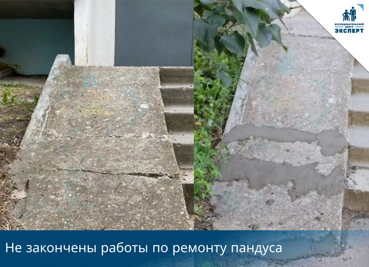3. Без противоскользящего покрытия. В итоге вышел не ремонт, а косметическая ретушь. Люди с ограниченной подвижностью по-прежнему не могут безопасно пользоваться пандусом.