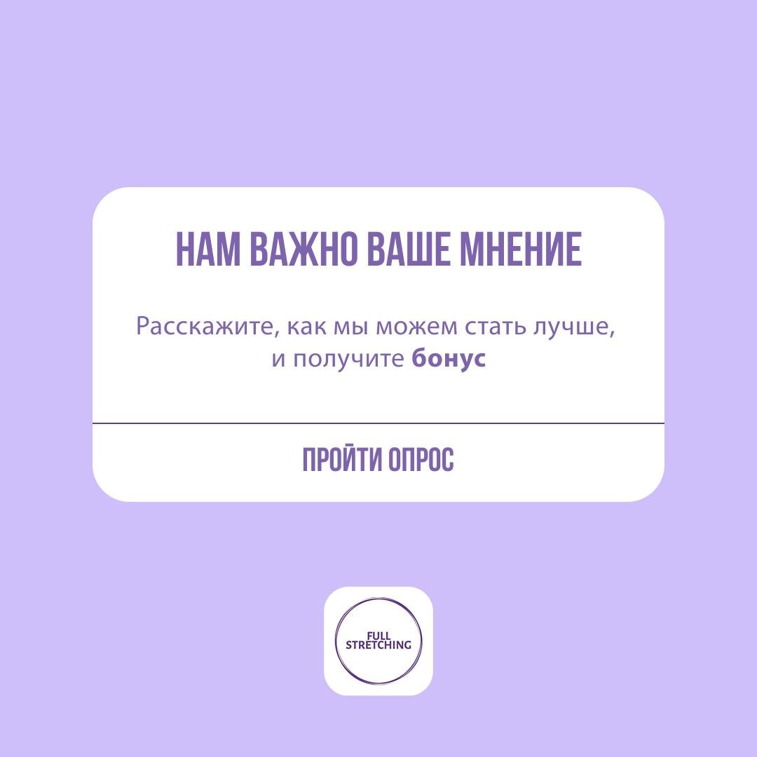 Нам важно ваше мнение! 💜 Мы стремимся делать нашу студию местом, куда хочется возвращаться снова и снова — за энергией и удовольствием от движения! Поучаствуйте в небольшом опросе (примерно 30 минут), мы будем очень благодарны и подарим приятный бонус! 🎁 Ответить можно прямо по ссылке ниже ⬇️ https://forms.gle/FYUjbReVAWfo5Cfq7 Спасибо за участие! 🥹