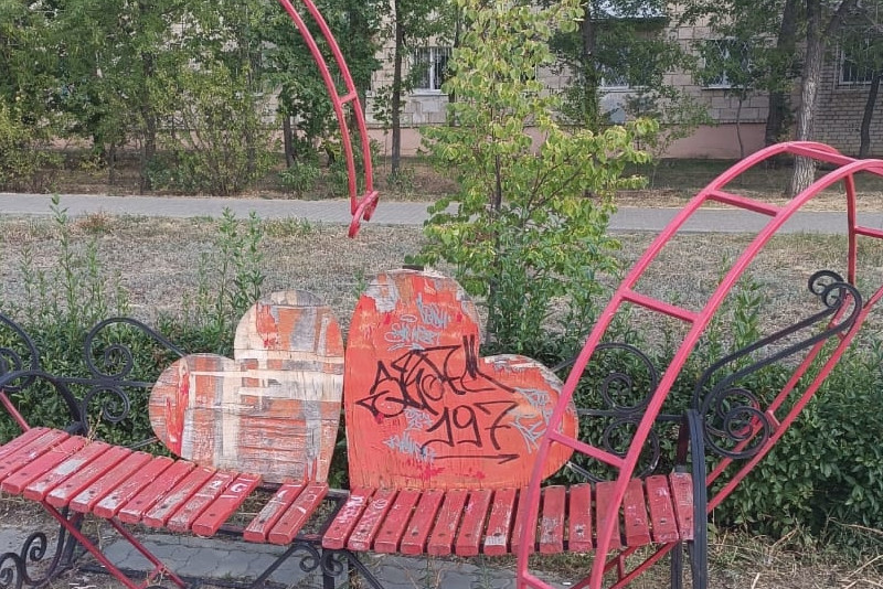 В августовские дни 2025 года скамья Любви — символ нежности и верности — оказалась разрушенной. Изогнутые железные формы, которым изначально придали форму сердец, разъединены и частично упали на тротуар. Металлопрокат серьёзно изогнут, видна ржавчина. Сама скамья пострадала от вандалов: фанерная основа ободрана и изукрашена надписями. По сути, скамья Любви разрушена. Возможно ли её восстановить — теперь большой вопрос…
