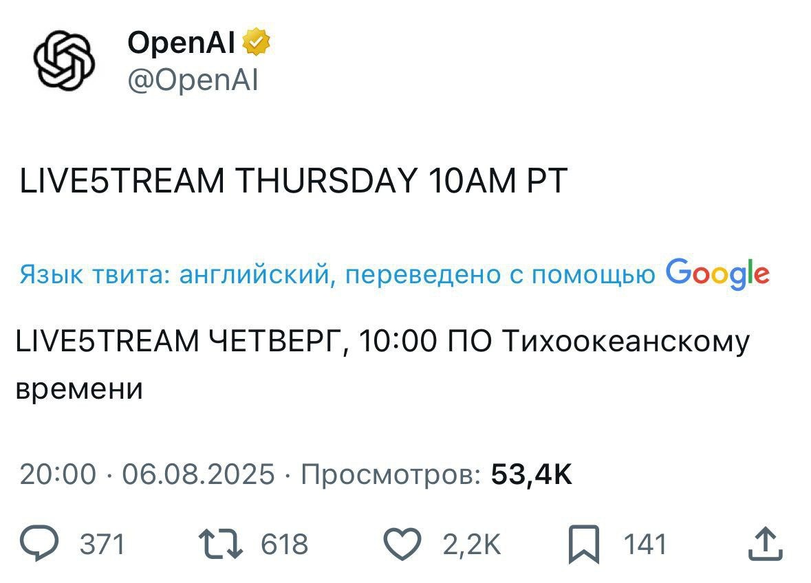 GPT-5 выйдет сегодня в 20:00 — OpenAI только что анонсировали трансляцию Это будет атомная бомба