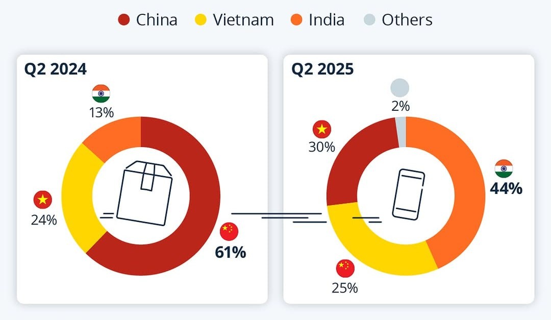 Во втором квартале 2025 года Индия стала крупнейшим поставщиком смартфонов в США, заняв 44% рынка