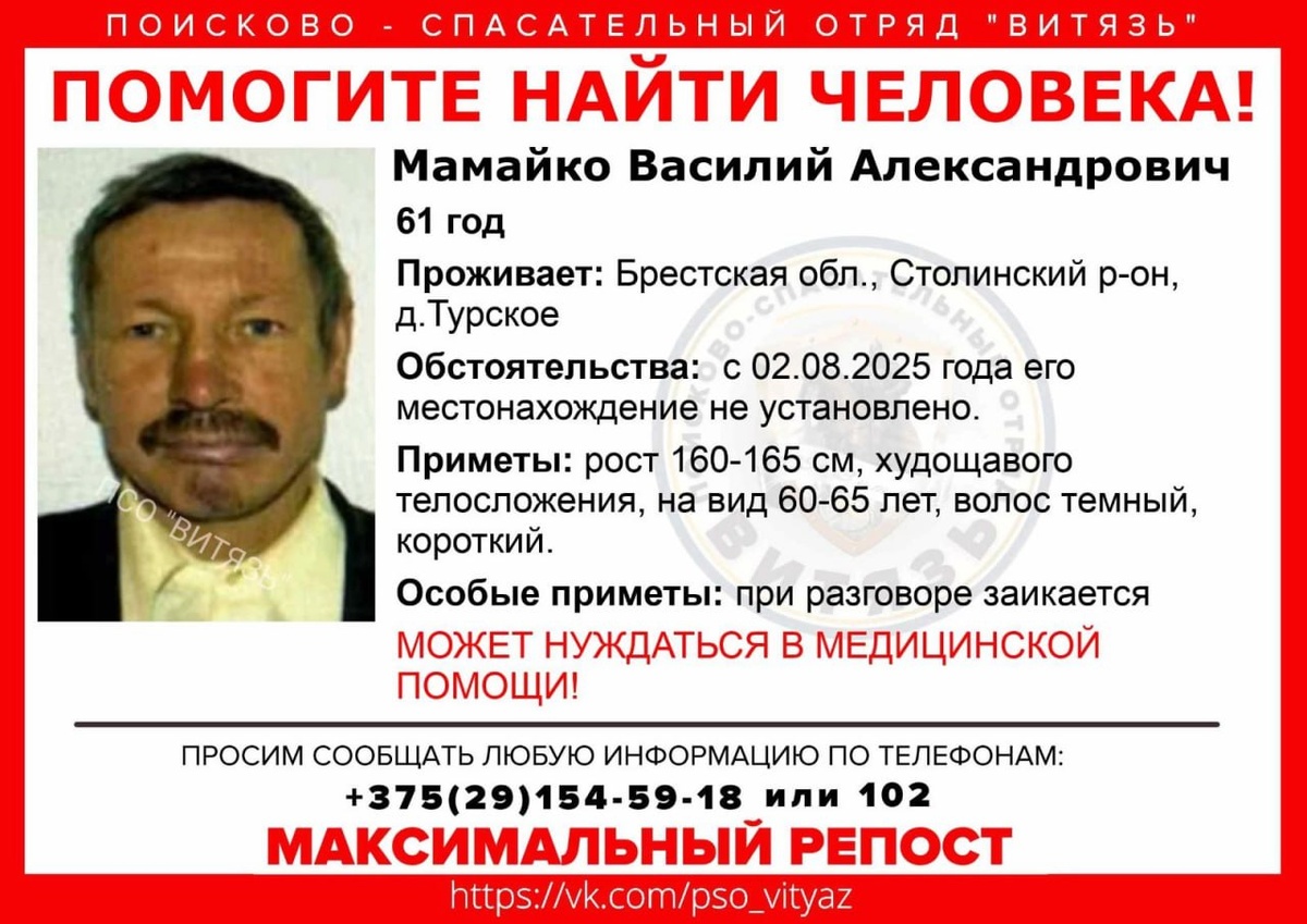 Внимание! Помогите найти человека! Пропал #Мамайко Василий Александрович , 61 год. Проживает: Брестская обл., Столинский р-он, д.Турское с 02.08.2025 года его местонахождение не установлено. Приметы: рост 160-165 см, худощавого телосложения, на вид 60-65 лет, волос темный, короткий. Особые приметы: при разговоре заикается Может нуждаться в медицинской помощи! Всех, кто владеет информацией, просим сообщить: ПСО "ВИТЯЗЬ" +375(29)154-59-18 #ПСО_Витязь psobelarus.ru/poisk4512....