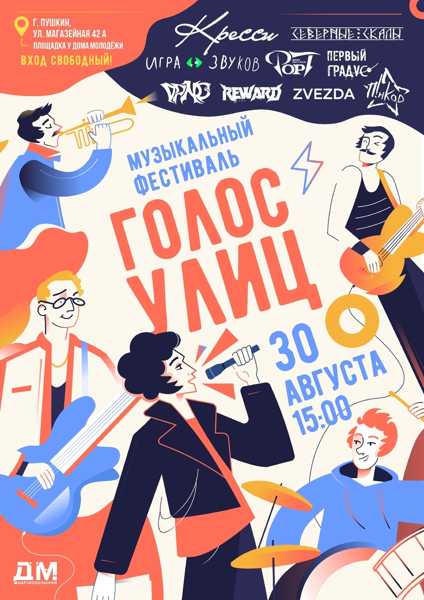 ✅Выступления самых ярких представителей пушкинской музыкальной сцены различных жанров: ПИНКОД, Кресси, Форт, ZVEZDA, Северные Скалы, REWARD, Первый Градус, Игра Звуков, DPNG
