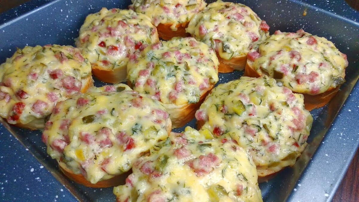 - Затем противень поставить в разогретую духовку до 150–180 градусов и запекать бутерброды в течение 7–10 минут. В конце переставить бутерброды на верхнюю полку или включить в духовке верхний нагрев, чтобы образовалась аппетитная корочка.