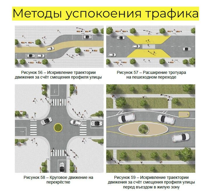 Методы успокоения трафика Методы успокоения трафика необходимы для повышения безопасности на дорогах, особенно в жилых районах, за счёт снижения скорости движения и уменьшения количества ДТП. Эти меры, создают более предсказуемую и безопасную среду, делая ту самую городскую среду более комфортной и приятной для всех, поощряя культуру безопасного вождения. Физические методы: - Лежачие полицейские. Выступы на проезжей части, вызывающие замедление скорости. Могут быть разной высоты и формы. - Повышенные переходы. Пешеходные переходы, приподнятые над уровнем дороги, вынуждают водителей снижать скорость. - Шиканы. Изгибы на дороге, чередующиеся слева и справа, создают препятствие для прямолинейного движения на высокой скорости. - Узкие проезды. Сужение полосы движения, например, за счет клумб или островков безопасности, замедляет движение. - Островки безопасности на пешеходных переходах. Предоставляют пешеходам безопасное место для ожидания и разделяют транспортные потоки. - Круговое дви