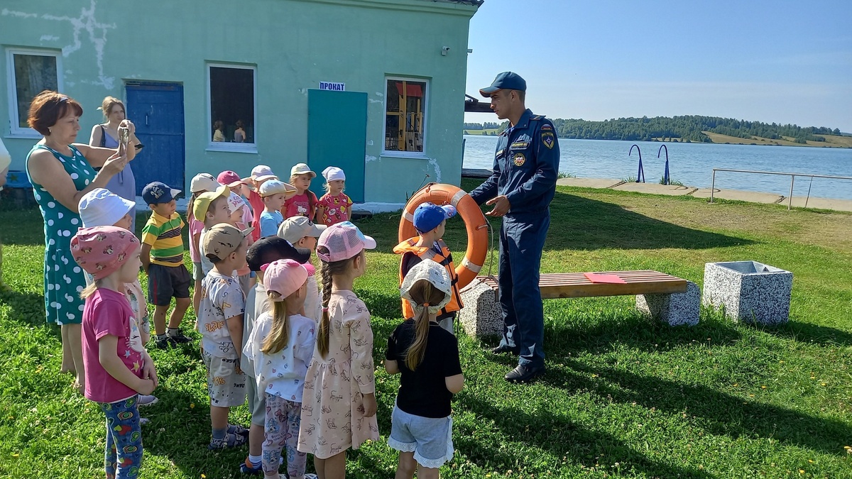 🌈В рамках акции «Безопасность детства» занятия малышей прошли на берегу. 🌞Погода нас радует солнышком, поэтому пожарные-спасатели 206-й пожарно-спасательной части и педагоги детского сада №32 решили провести урок для малышей на свежем воздухе, а место занятий - ⛱пляж кушвинского пруда. 👨🚒Начальник караула Иван Швыркалов спросил у ребят, чем может быть опасна вода, если купаться одним, без родителей? И был приятно удивлён правильными ответами детей. Они сказали, что водичка может быть холодная, на дне острые камешки и вообще они лялечки! Далее обсудили, что делать, если увидели тонущего в воде человека. - Детям самим бежать спасать ни в коем случае нельзя, а сказать об этом взрослым, тем кто находится рядом и еще не заметил терпящего бедствие, нужно немедленно и только они будут принимать меры к спасению! Иван Владимирович показал ребятам спасательный круг и жилет. Объяснил, как ими пользоваться. Отметил, что эти вещи необходимо брать с собой при катании в лодке, а Показать пол