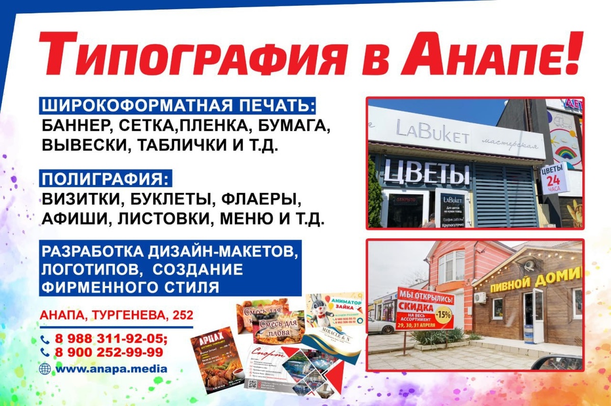 ❗️Типография в Анапе! Изготовление рекламы!💥 💥Баннеры, самоклеющаяся плёнка, наклейки, таблички из пластика, вывески, оформление кафе, магазинов, гостиниц...в Анапе! 💥Визитки, флаеры, листовки, буклеты, плакаты, меню, ценники, пригласительные....в Анапе! 💥Брендированные майки, фартуки, флаги, банданы... 💥Дизайн! 💥Замеры и монтаж на объекте заказчика. ❗️Скидки! 📲Обращаться по телефонам: 8-988-311-92-05, 8-900-252-99-99. #РекламаАнапа #ТипографияАнапа #ВизиткиАнапа #ФлаераАнапа #БуклетыАнапа #БаннераАнапа #НаклейкиАнапа #ВывескиАнапа #ИзготовлениеРекламыАнапа #АнапаМедиа #АнапаРеклама #ТипографияВАнапе #ИзготовлениеВывесокАнапа #ПолиграфияАнапа #ТабличкиАнапа #ПилоныАнапа #НаклейкиАнапа #БилбордыАнапа #Анапа #АнапаМедиа